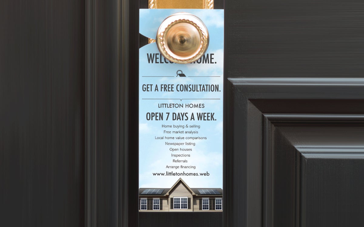 Door hangers are cardstock signs that have a die-cut hole that allows you to suspend from the knob or handle of a door. Door hangers are super economical which makes them a popular choice for consumer marketing.